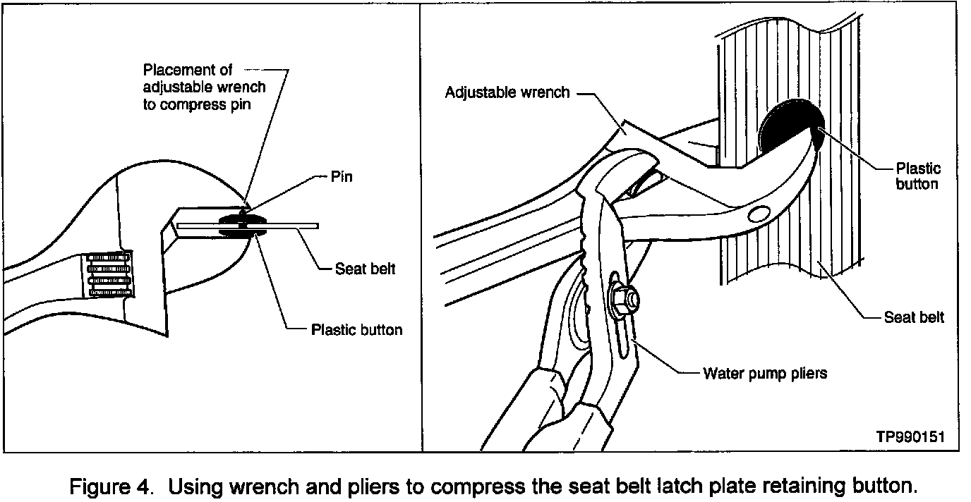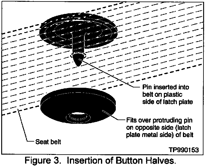 2. Verify the seat belt is not "twisted" by sitting in the seat and latching seat belt. Correct twisted condition before beginning button replacement.
