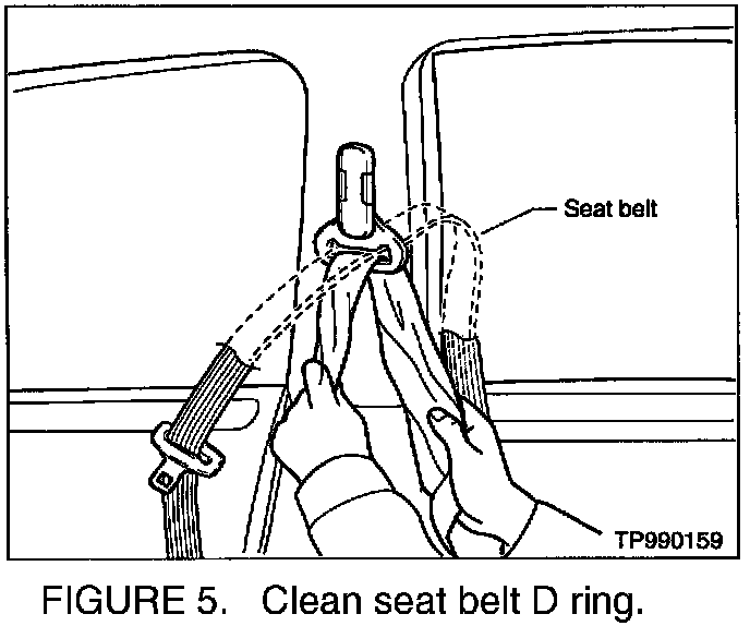 13. Remove any residue buildup using a piece of cheese cloth or cotton gauze (such as found in a First Aid Kit). Insert the cloth under the seat belt, between the belt and the D ring, and slide it back and forth over the D ring where it contacts the seat belt (see Figure 5) until all residue is removed.