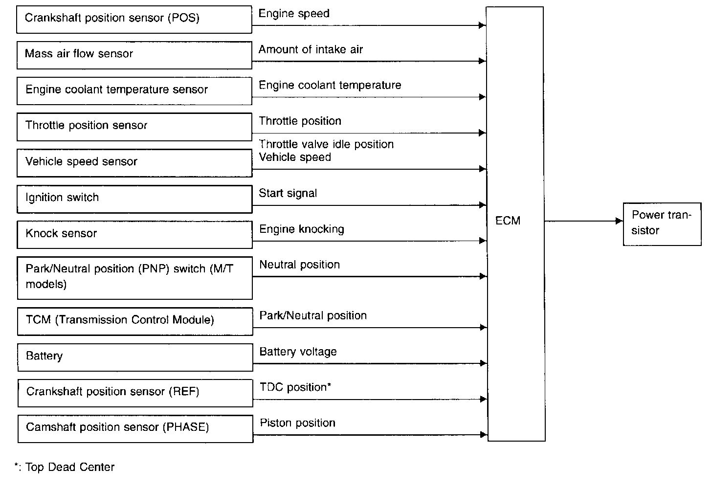 The ECM detects information such as the injection pulse width and camshaft position sensor signal. Responding to this information, ignition signals are transmitted to the power transistor.
