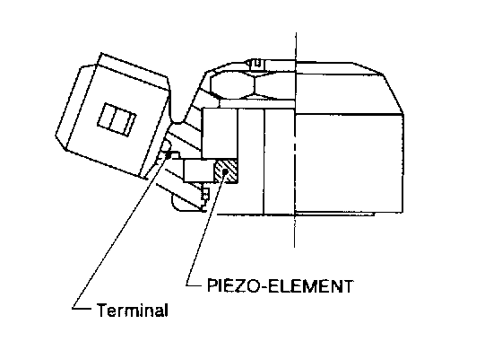 The knock sensor is attached to the cylinder block. It senses engine knocking using a piezoelectric element. A knocking vibration from the cylinder block is sensed as vibrational pressure. This pressure is converted into a voltage signal and sent to the ECM.