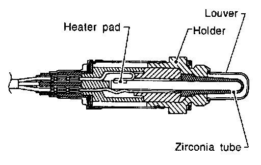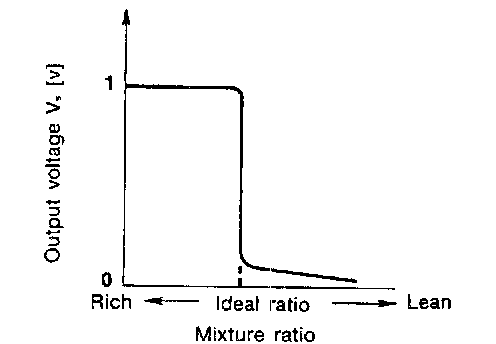 The front heated oxygen sensor is placed into the exhaust manifold. It detects the amount of oxygen in the exhaust gas compared to the outside air. The front heated oxygen sensor has a closed-end tube made of ceramic zirconia. The zirconia generates voltage from approximately 1 V in richer conditions to 0 V in leaner conditions. The front heated oxygen sensor signal is sent to the ECM. The ECM adjusts the injection pulse duration to achieve the ideal air-fuel ratio. The ideal air-fuel ratio occurs near the radical change from 1 V to 0 V.