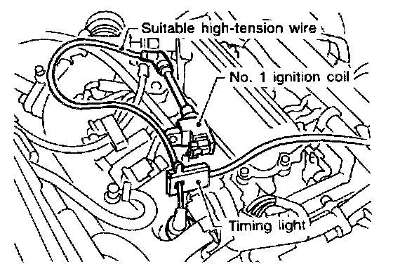 2. Connect No. 1 ignition coil and No. 1 spark plug with suitable high-tension wire as shown, and attach timing light clamp to this wire.