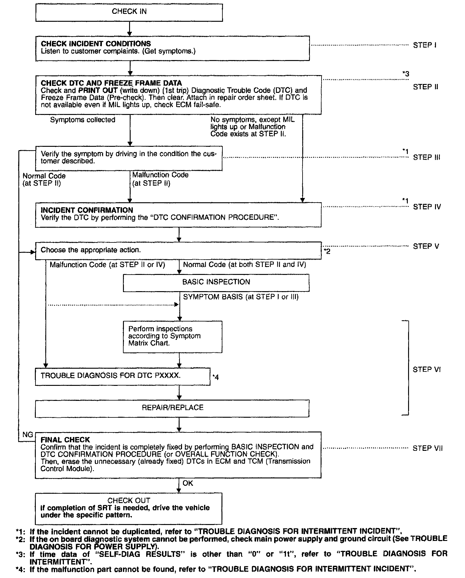 STEP II: Before confirming the concern, check and write down (print out using CONSULT or Generic Scan Tool) the Diagnostic Trouble Code (DTC) and the (1st trip) freeze frame data, then erase the code and the data. Reading Diagnostic Trouble CodesThe (1st trip) DTC and the (1st trip) freeze frame data can be used when duplicating the incident at STEP III & IV.