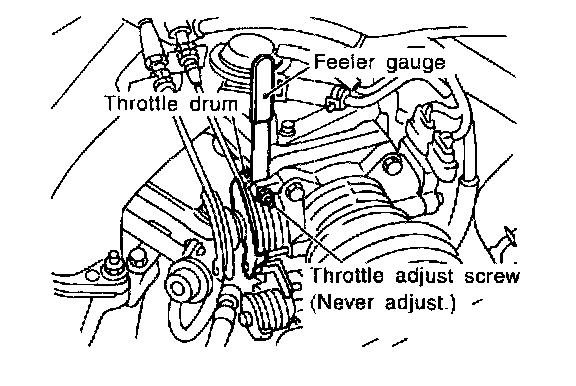 - Insert 0.3 mm (0.012 in) feeler gauge between throttle adjust screw and throttle drum as shown in the figure and check the following.