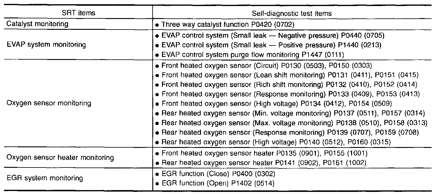 To set all SRT codes, self-diagnosis for the items indicated above must be performed one or more times. Each diagnosis may require a long period of actual driving under various conditions. The most efficient driving pattern in which SRT codes can be properly set is explained in the driving pattern. The driving pattern should be performed one or more times to set all SRT codes.