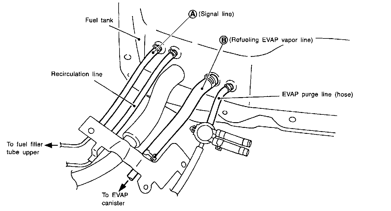 Blow air into the hose end (B). Air should flow freely into the fuel tank.