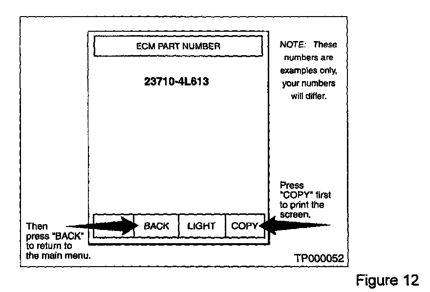 13. Press "COPY" to print the ECM PART NUMBER screen (see Figure 12). Attach this printout to the repair order. Then press "BACK" to return to the CONSULT-II main menu.