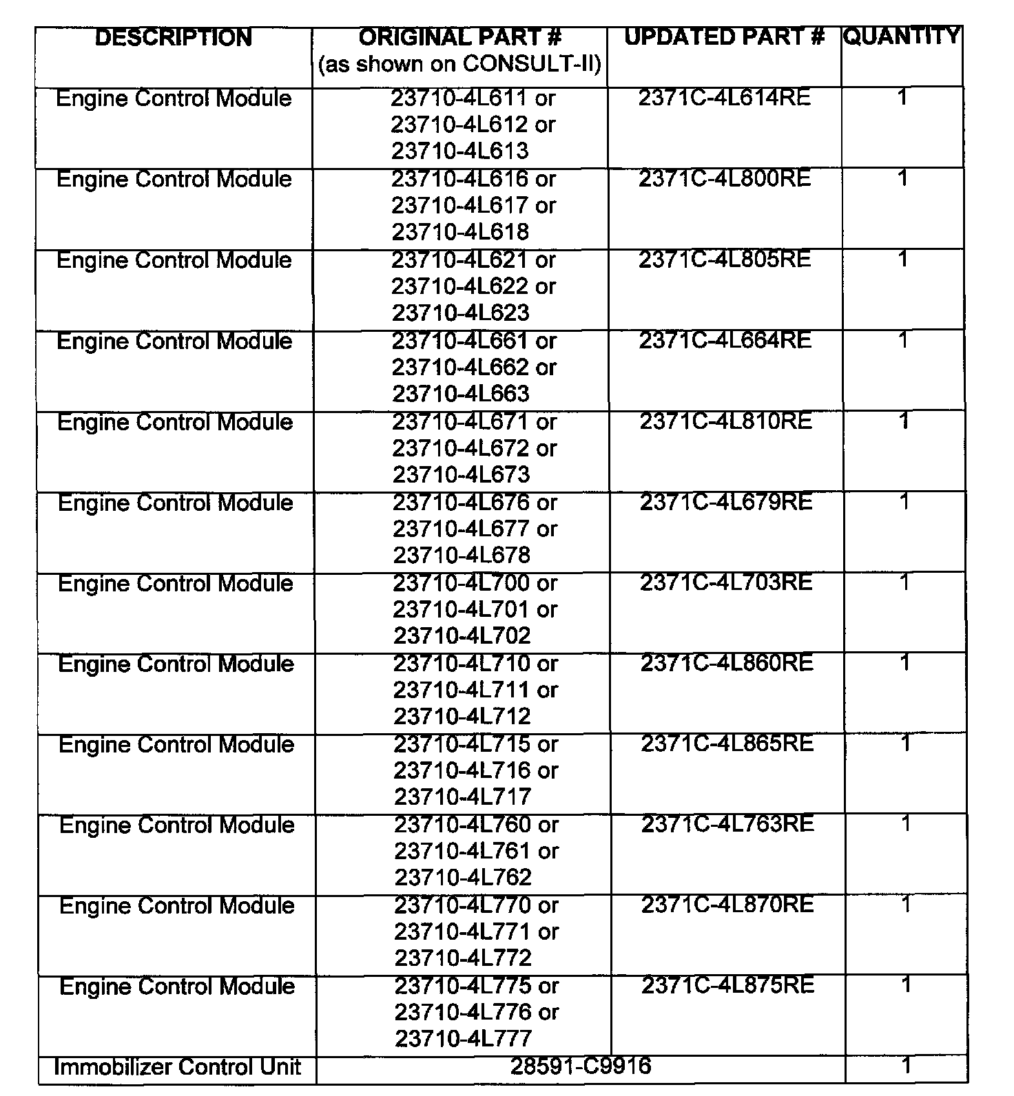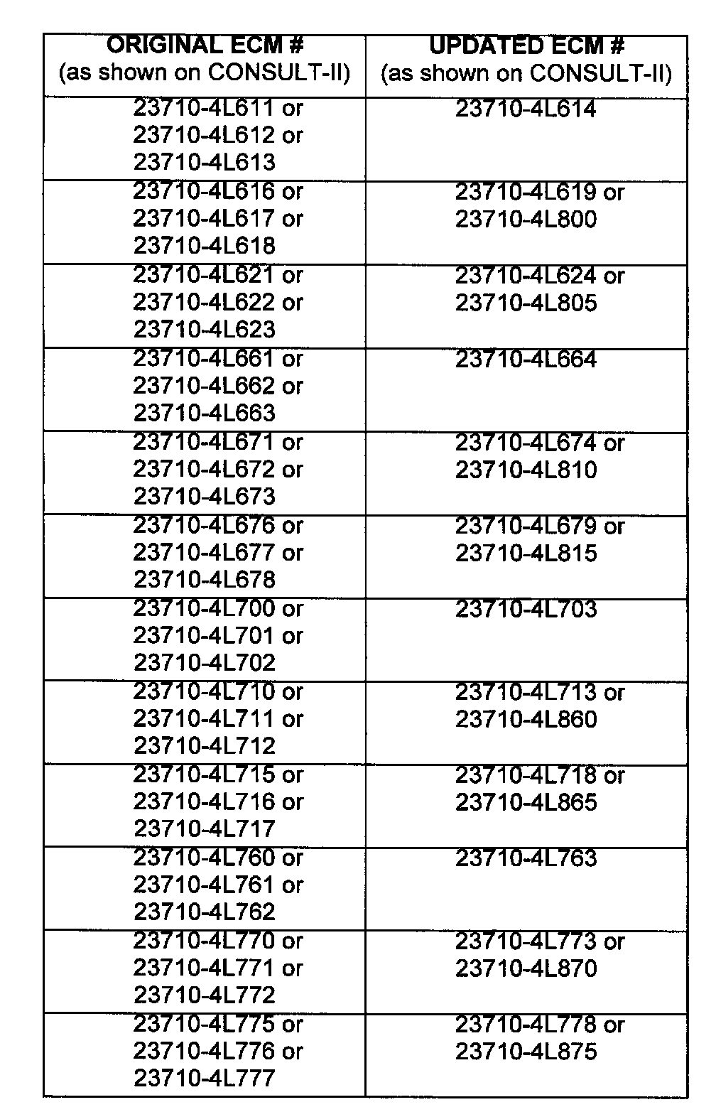 15. Compare the vehicle's ECM PART NUMBER as printed from CONSULT-II in step 13 to the ECM # in the chart below.