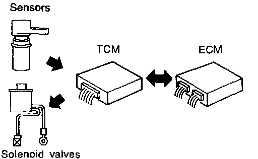 The TCM also communicates with the ECM by means of a signal sent from sensing elements used with the OBD-related parts of the A/T system for malfunction-diagnostic purposes. The TCM is capable of diagnosing malfunctioning parts while the ECM can store malfunctions in its memory.