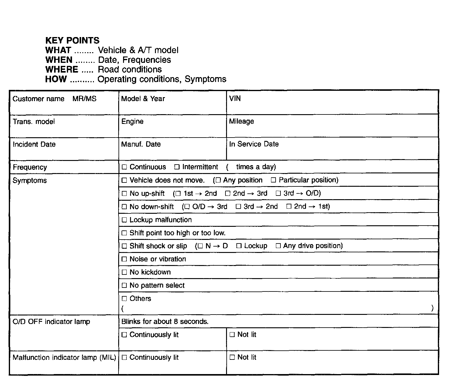 A good understanding of the malfunction conditions can make troubleshooting faster and more accurate. In general, each customer feels differently about a problem. It is important to fully understand the symptoms or conditions for a customer complaint. Make good use of the two sheets provided, "INFORMATION FROM CUSTOMER" and "DIAGNOSTIC WORKSHEET, to perform the best troubleshooting possible.