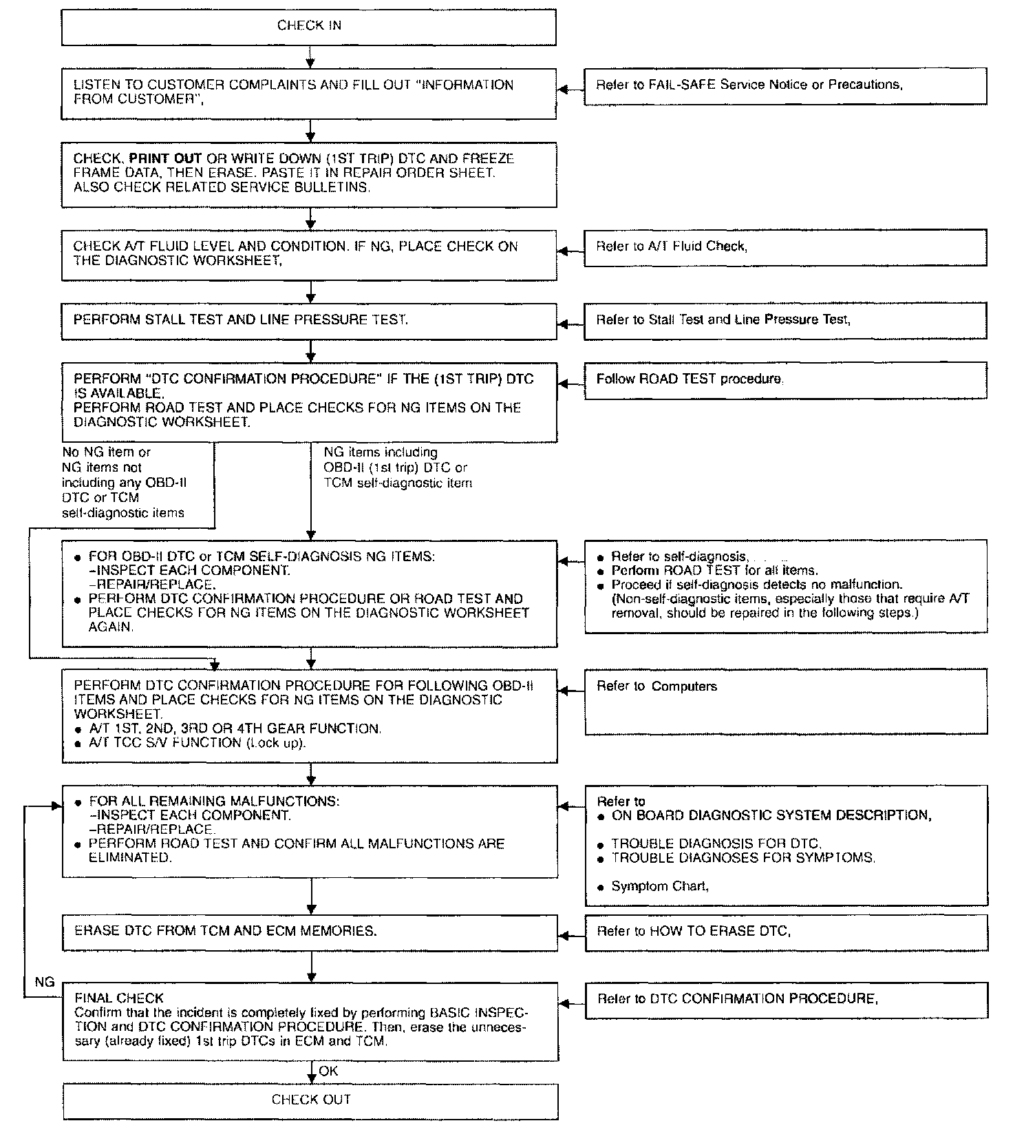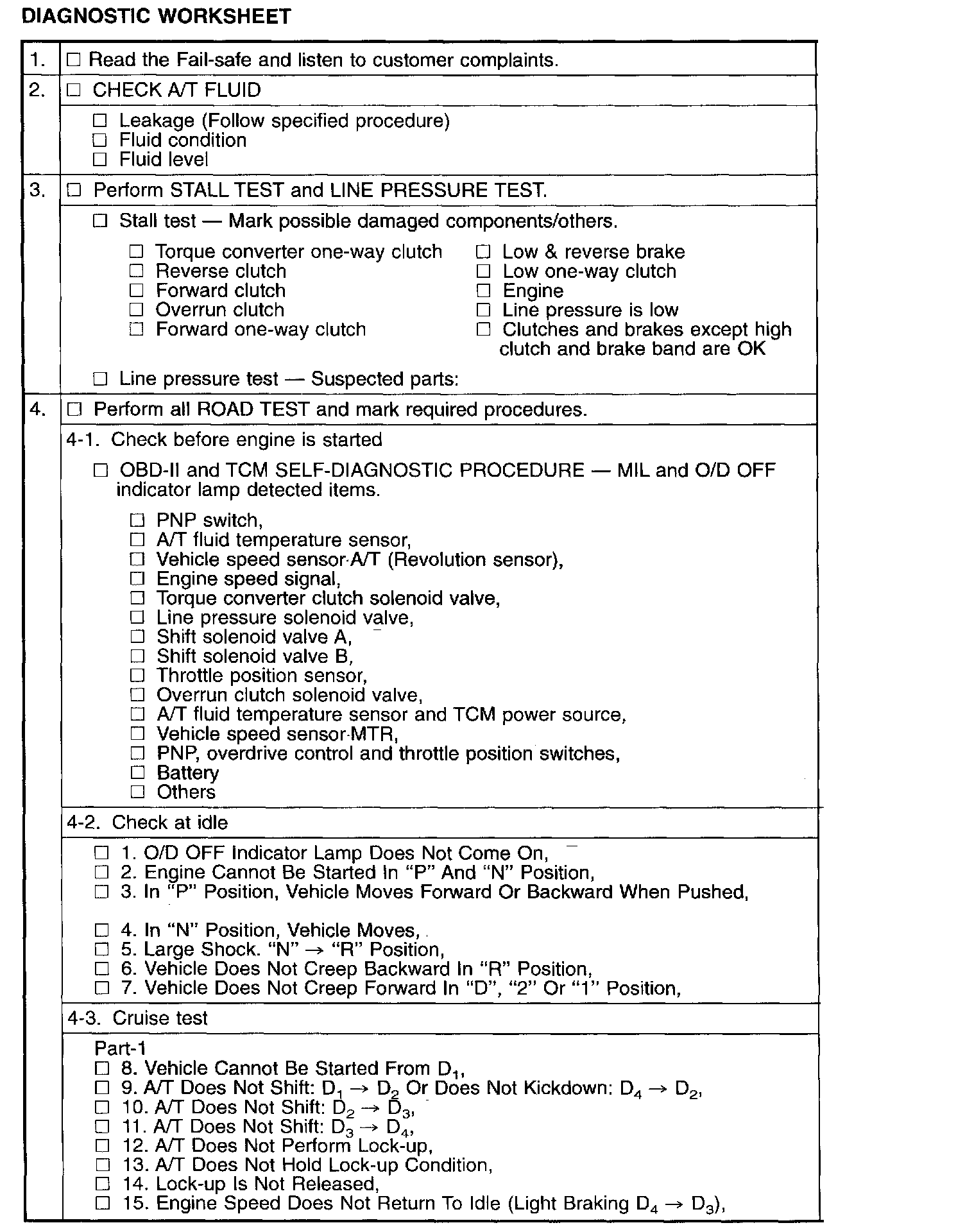 Input and output signals must always be correct and stable in the operation of the A/T system. The A/T system must be in good operating condition and be free of valve seizure, solenoid valve malfunction, etc.