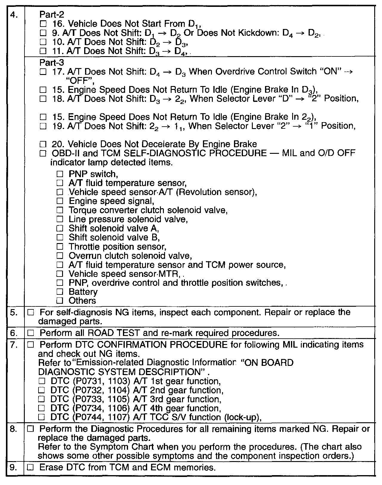 The second is the TCM original self-diagnosis indicated by the O/D OFF indicator lamp. The malfunction is stored in the TCM memory. The detected items are overlapped with OBD-II self-diagnostic items.