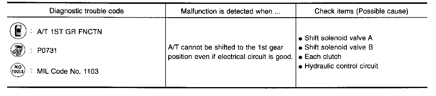 - This malfunction is detected when the A/T does not shift into first gear position as instructed by the TCM. This is not caused by electrical malfunction (circuits open or shorted) but by mechanical malfunction such as control valve sticking, improper solenoid valve operation, etc.