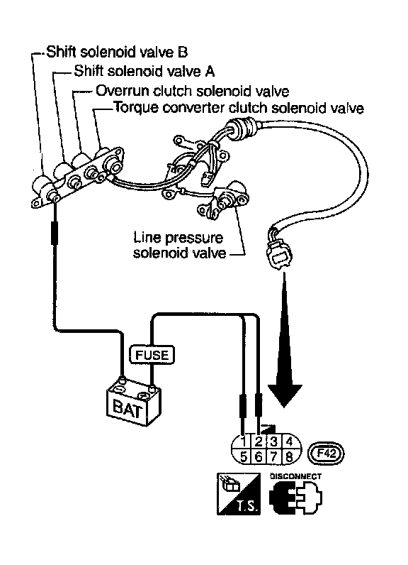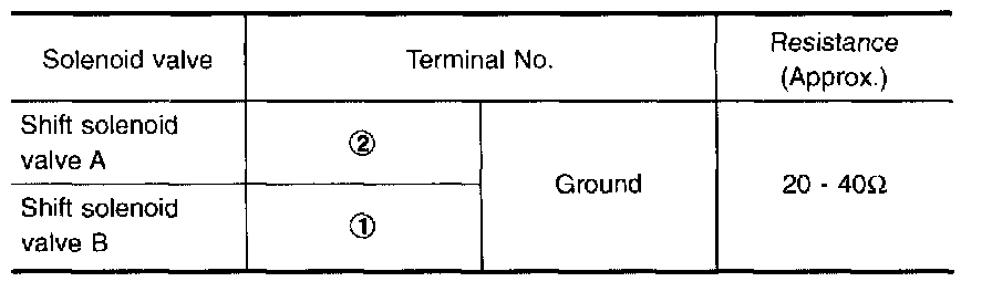 - Check solenoid valve by listening for its operating sound while applying battery voltage to the terminals (1), (2) and ground