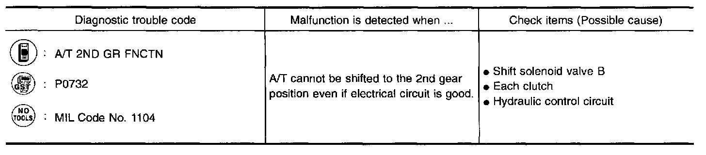 - This malfunction is detected when the A/T does not shift into second gear position as instructed by the TCM. This is not caused by electrical malfunction (circuits open or shorted) but by mechanical malfunction such as control valve sticking, improper solenoid valve operation, etc.