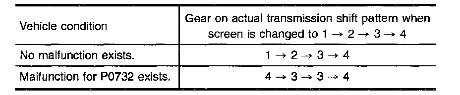 - If "TESTING" does not appear on CONSULT for a long time, select "SELF-DIAG RESULTS" for "ENGINE". In case a 1st trip DTC other than P0732 is shown, refer to applicable "TROUBLE DIAGNOSIS FOR DTC".