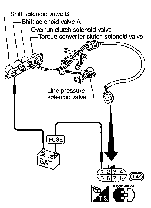 - Check solenoid valve by listening for its operating sound while applying battery voltage to the terminal (1) and ground.