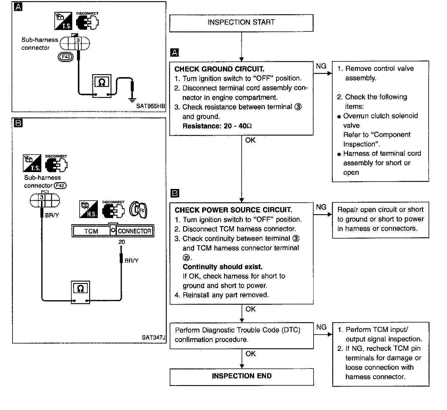 NOTE: If "DIAGNOSTIC TROUBLE CODE CONFIRMATION PROCEDURE" has been previously conducted, always turn ignition switch "OFF" and wait at least 5 seconds before conducting the next test.