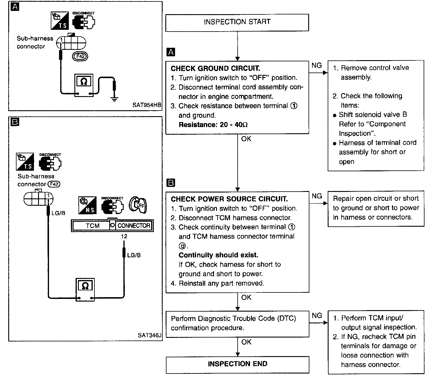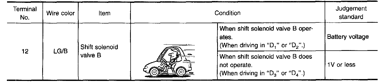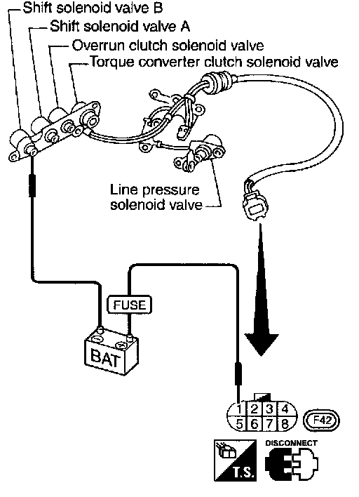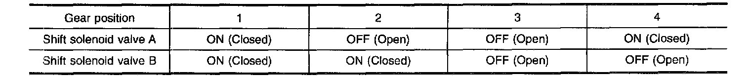 Shift solenoid valves A and B are turned "ON" or "OFF" by the TCM in response to signals sent from the PNP switch, vehicle speed and throttle position sensors. Gears will then be shifted to the optimum position.