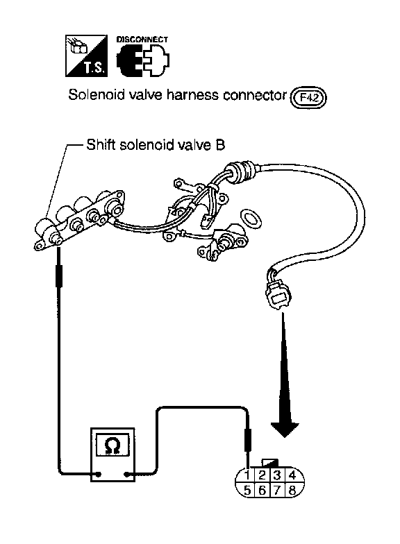 - Check solenoid valve by listening for its operating sound while applying battery voltage to the terminal (1) and ground.