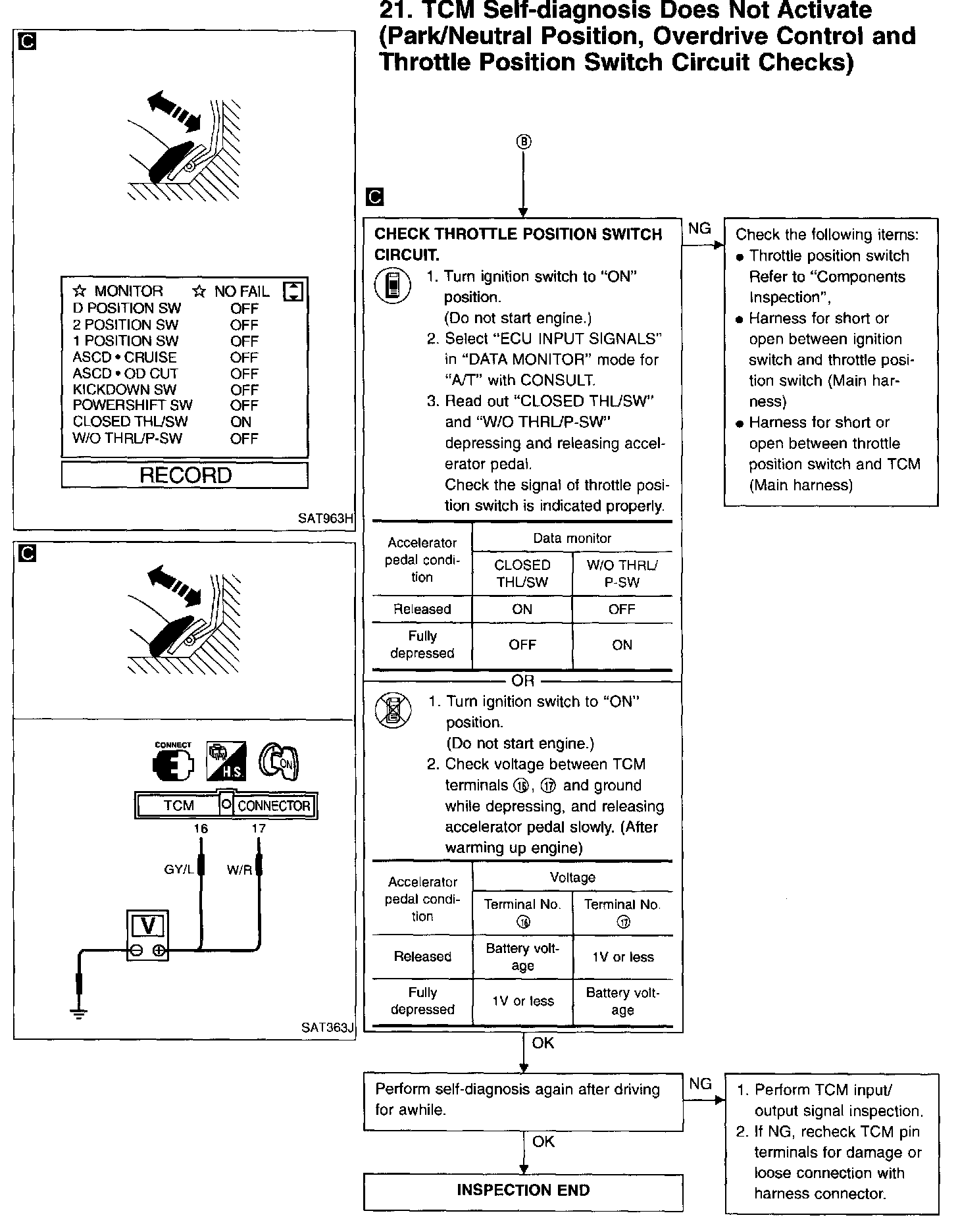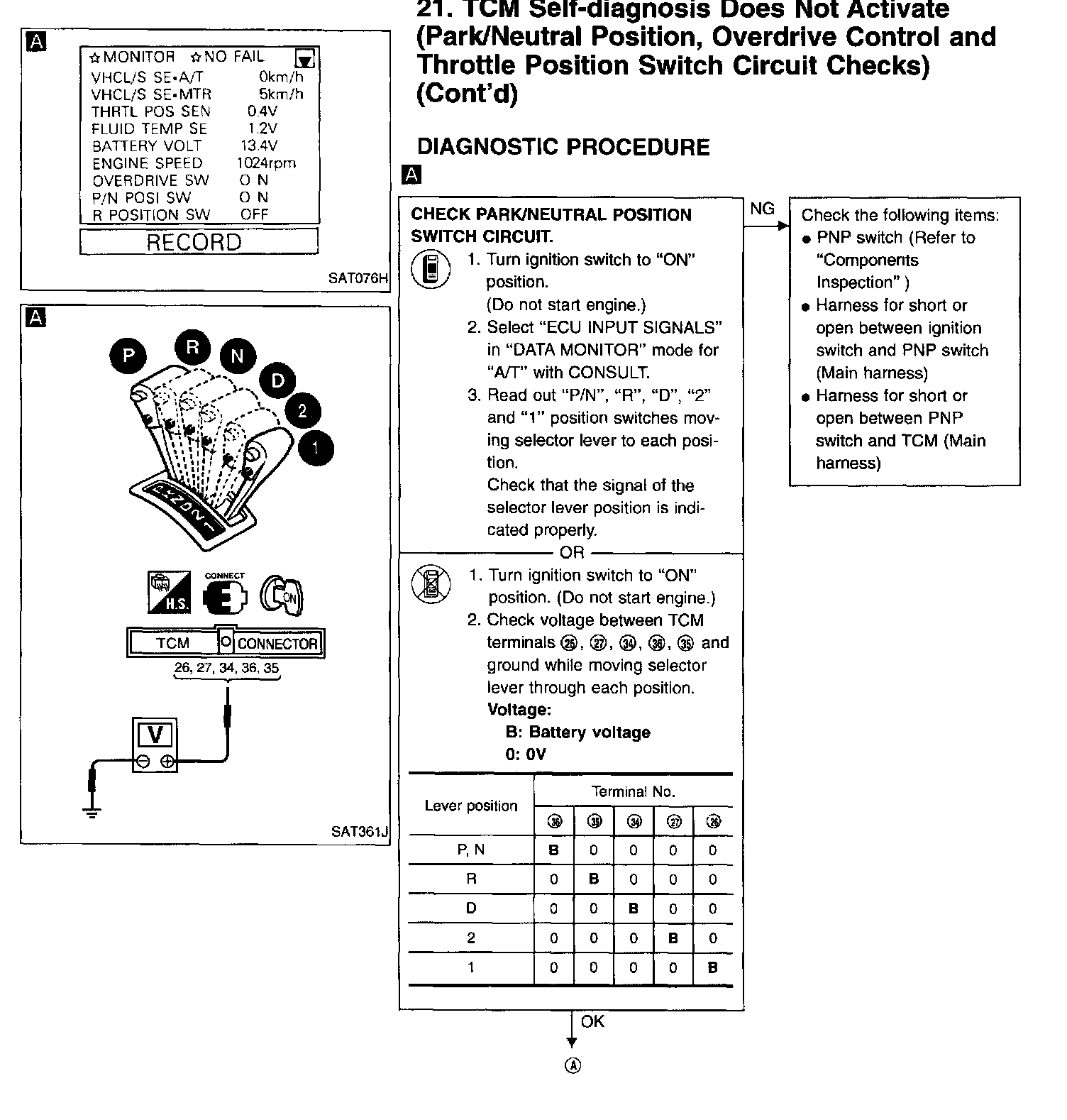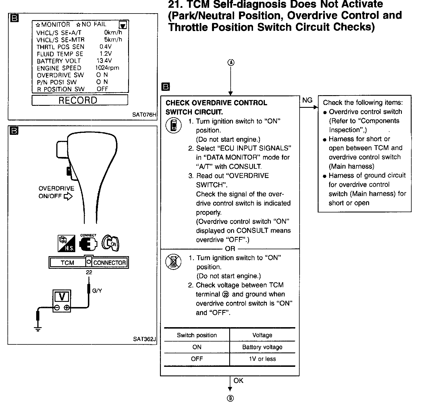 21. TCM Self-diagnosis Does Not Activate (Park/Neutral Position, Overdrive Control and Throttle Position Switch Circuit Checks)SYMPTOM: O/D OFF indicator lamp does not come on in TCM self-diagnostic procedure even if the lamp circuit is good.
