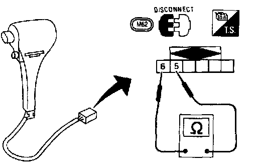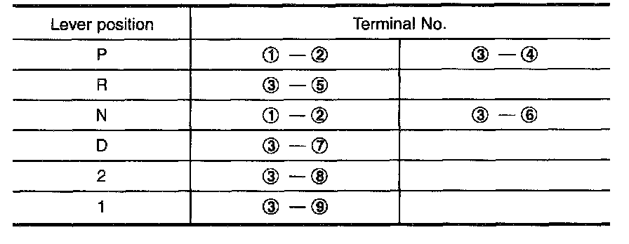 1. Check continuity between terminals (1) and (2) and between terminals (1) and (2), (3), (4), (5), (6), (7), (8), (9) while moving manual shaft through each position.