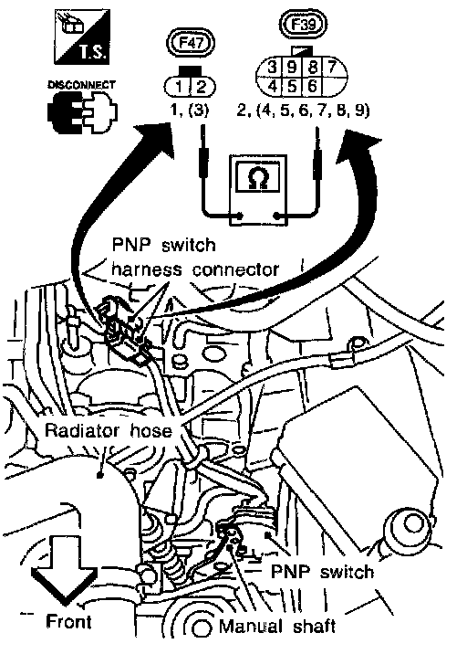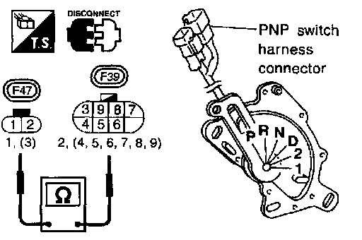 4. If NG on step 2, remove PNP switch from A/T and check continuity of PNP switch terminals. Refer to step 1.
