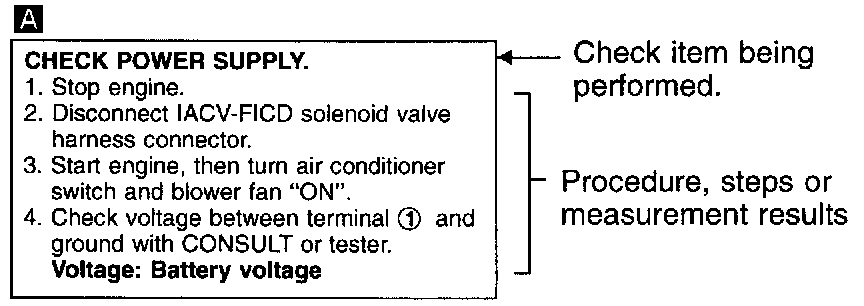 Illustrations are provided as visual aids for work procedures. For example, symbol [A] indicated in the left upper portion of each illustration corresponds with the symbol in the flow chart for easy identification. More precisely, the procedure under the "CHECK POWER SUPPLY" outlined previously is indicated by illustration [A].