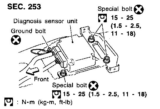 4. Remove ground bolt and also remove special bolts using the TAMPER RESISTANT TORX (Size T50), from diagnosis sensor unit.