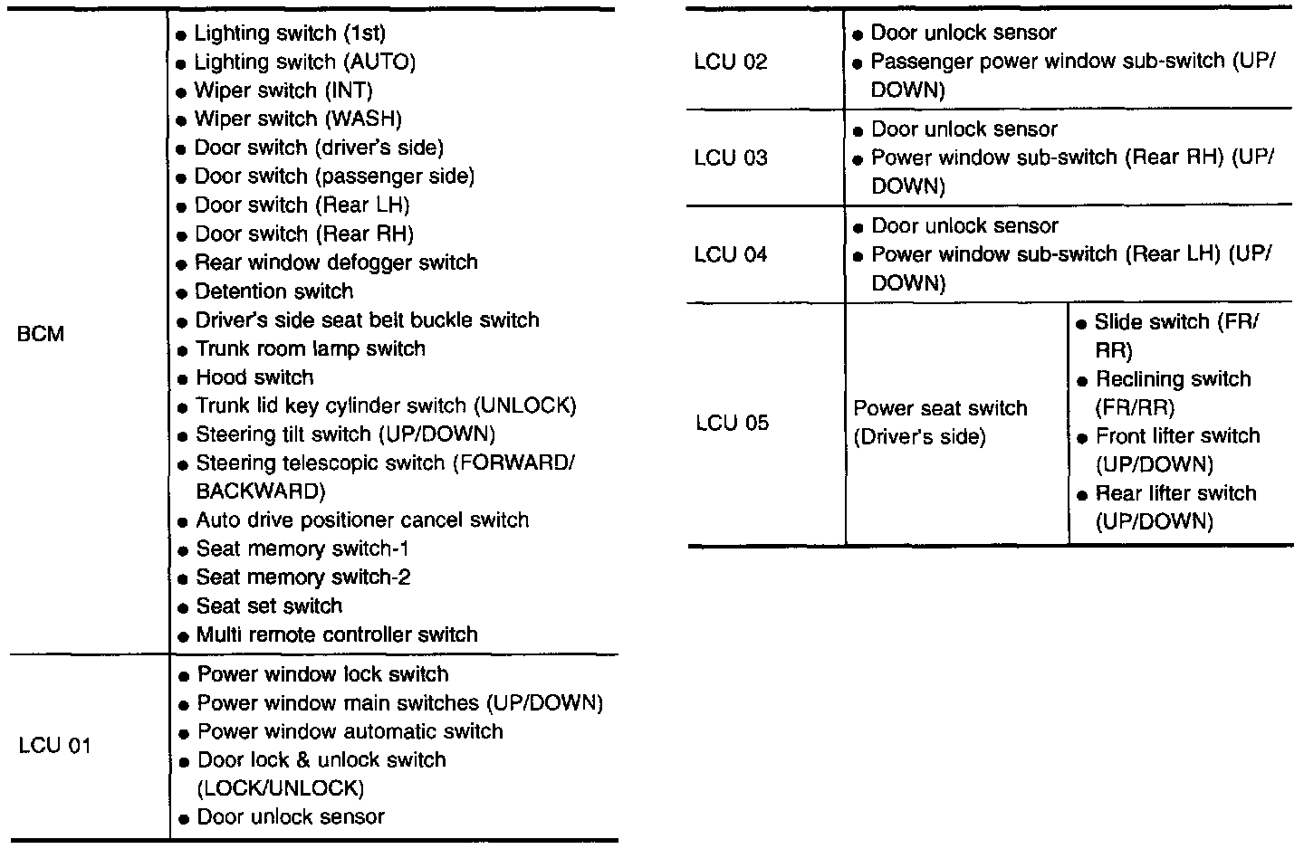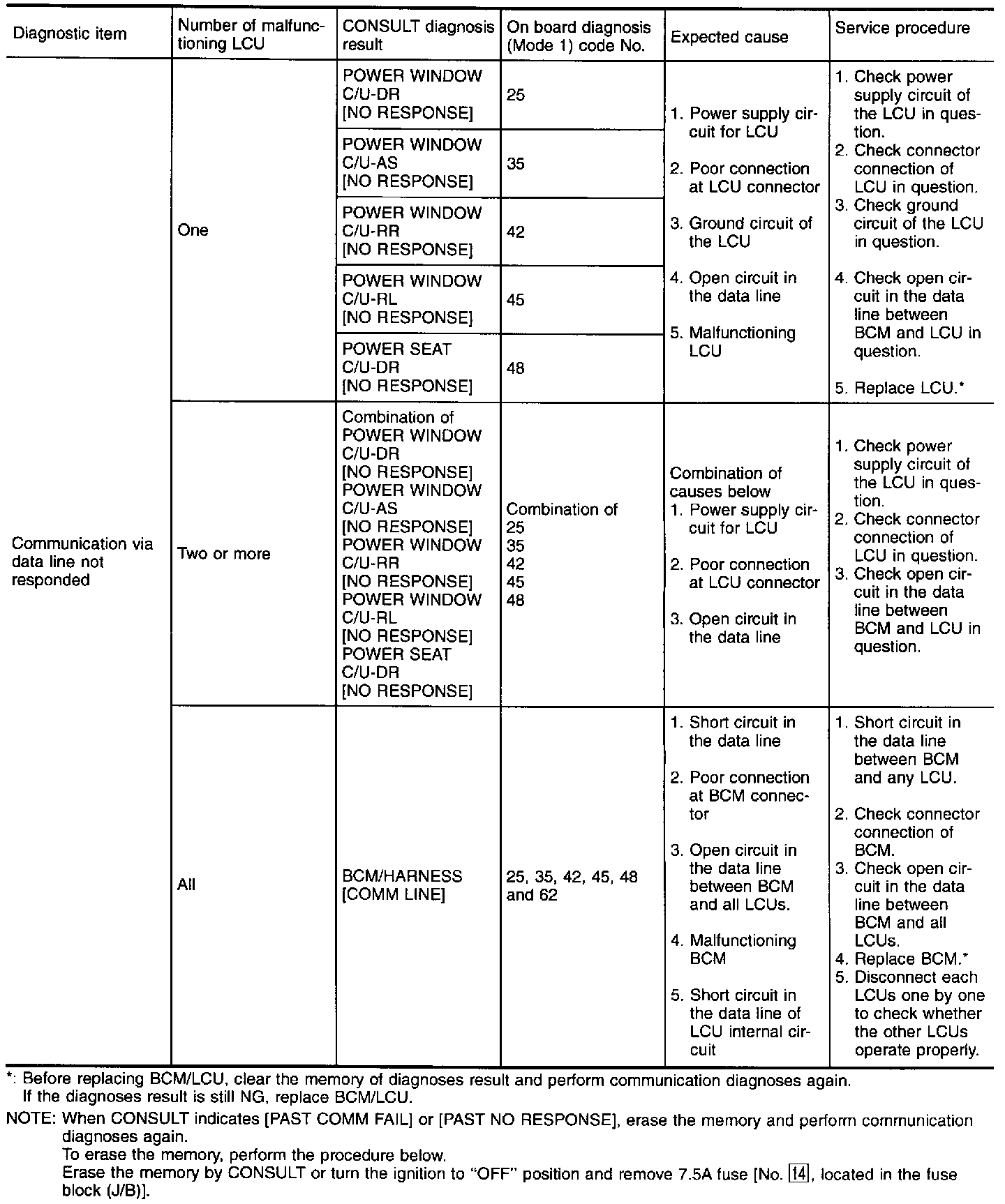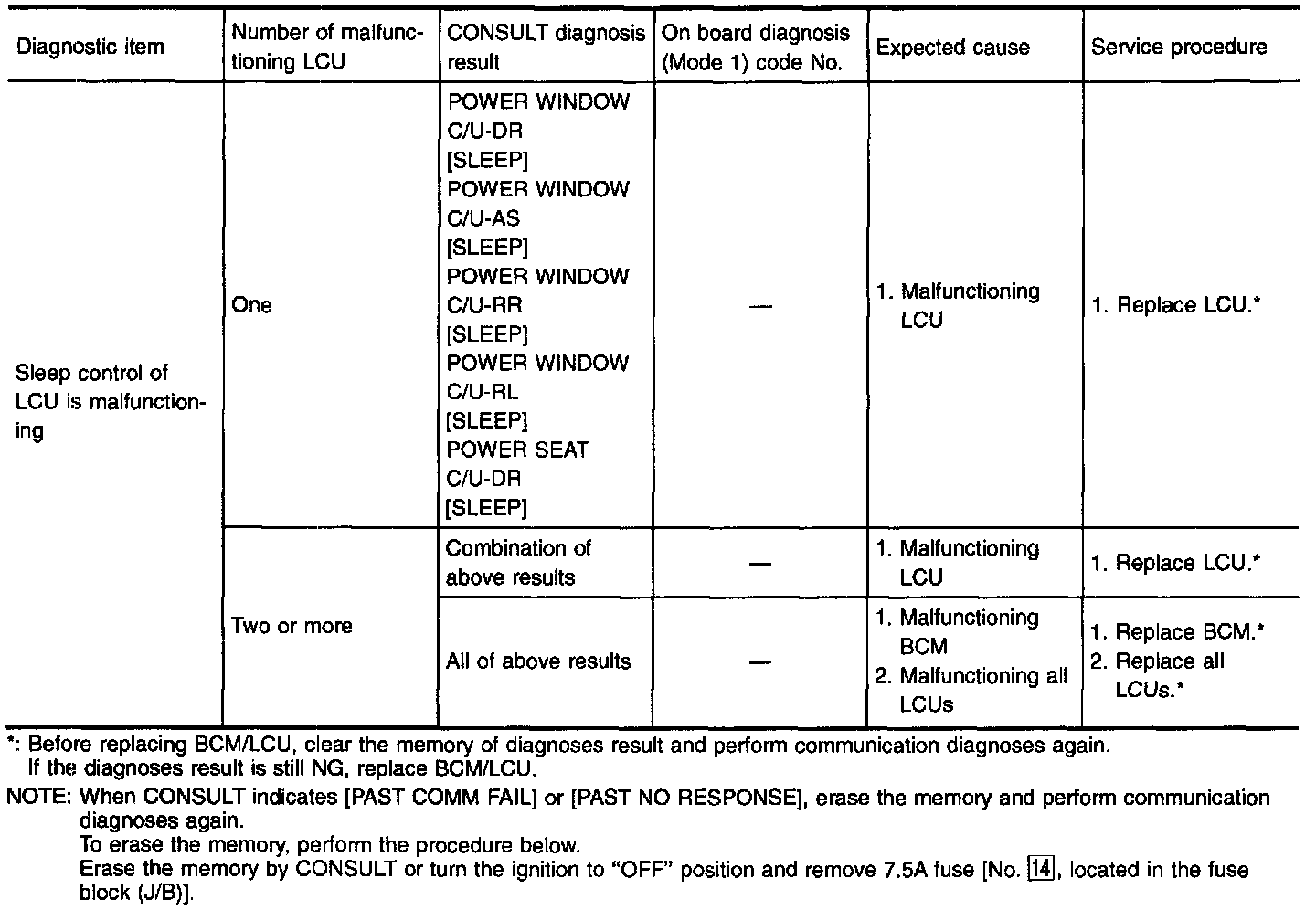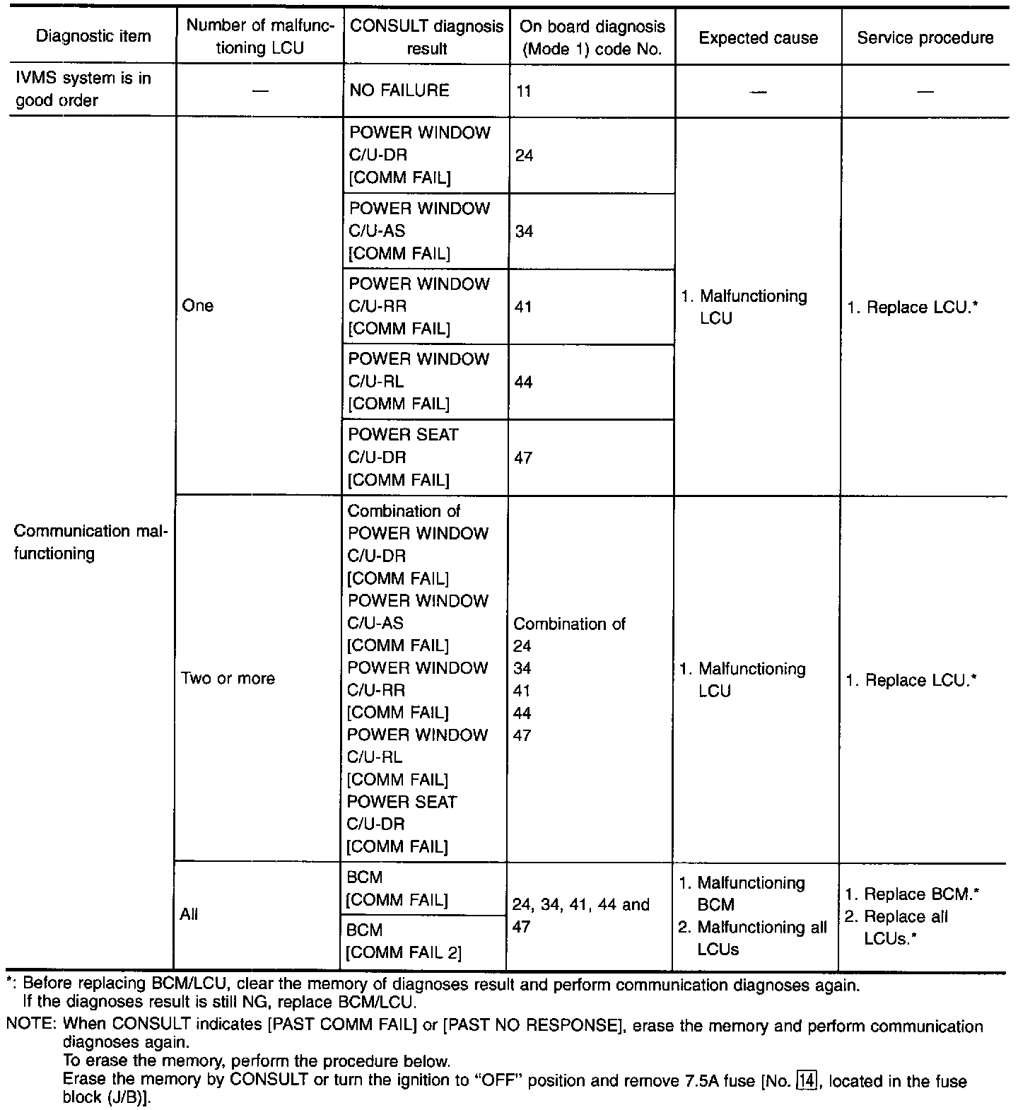 - When LCU connectors are disconnected for more than 1 minute such as during trouble diagnoses, the "disconnected" data will be memorized by the BCM. (While BCM memorizes the "disconnected" data, IVMS communication diagnosis of CONSULT will display "PAST NO RESPONSE".) Therefore, afier reconnecting the LCU connectors, erase the memory.