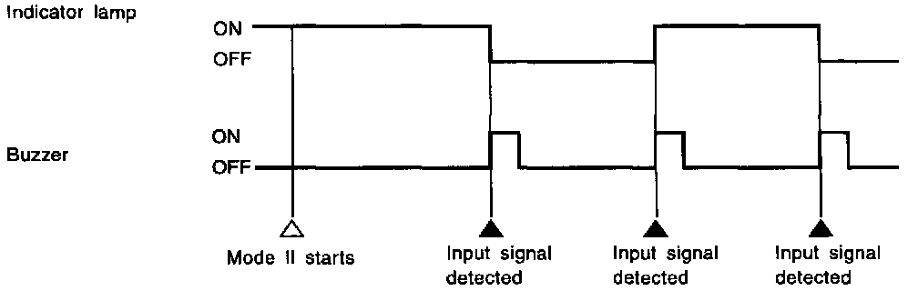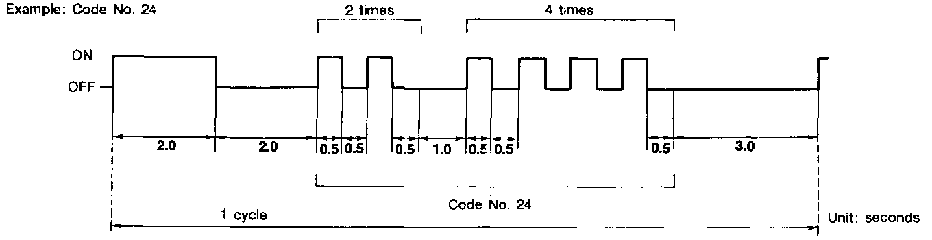 After indicator lamp turns on for 2 seconds then off for 2 seconds, it flashes [cycling ON (0.5 secs.)/OFF (0.5 secs.)] to indicate a malfunction code of the first digit. Then, 1 second after indicator lamp turns off, it again flashes [cycling ON (0.5 secs.)/OFF (0.5 secs.)] to indicate a malfunction code of the second digit.