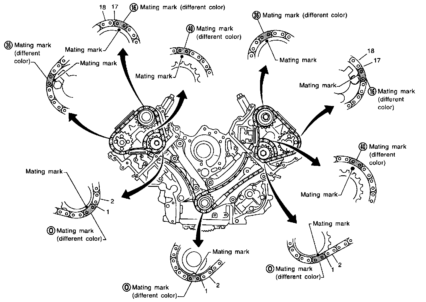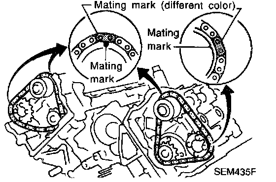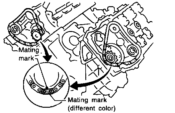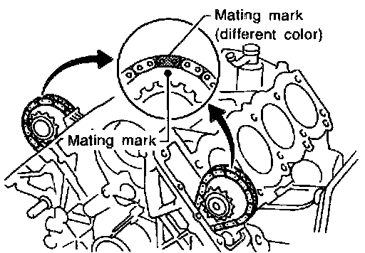 - Refer to the figure and align the mating marks on each sprocket and timing chain.