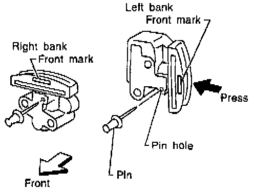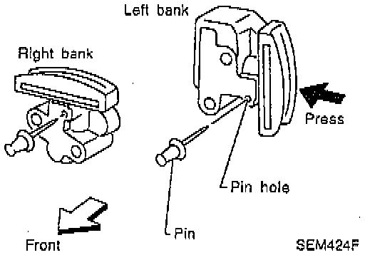 - Press tensioner in and insert 1 mm (0.04 inch) diameter pin in pin hole. After securing tensioner, remove bolts.