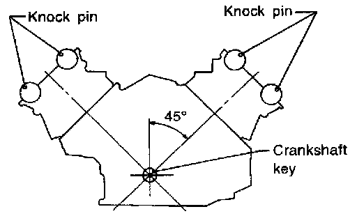 1. Check that crankshaft key faces upward at 45° angle in direction of left bank axis when viewed from the front.