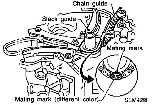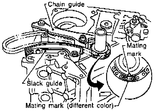 - Make sure the timing chain and idler sprocket mating marks do not become misaligned during the installation operation.