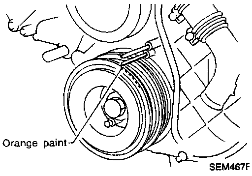Align the timing mark (orange paint) on crankshaft pulley with timing indicator on front cover.