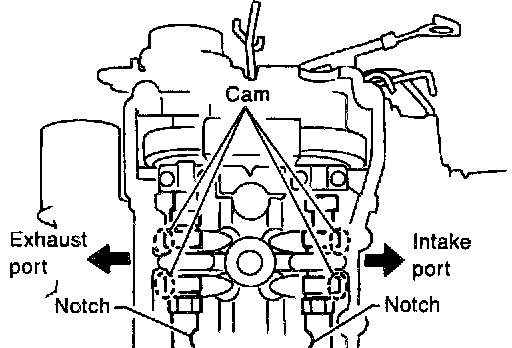 Make sure the intake camshaft lobe for the No. 1 cylinder faces the intake port and the exhaust lobe faces the exhaust port. Reference: It is possible to confirm camshaft positions by checking notch positions on the camshaft when No. 1 piston is at TDC of the compression stroke. This is the position where cylinder head bolts can be removed.
