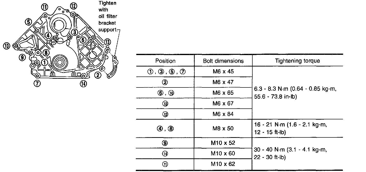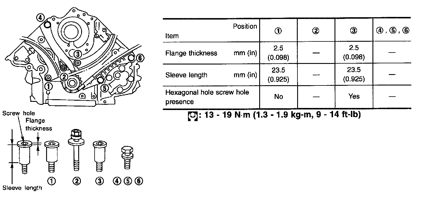 - The bolt dimensions and tightening torque vary depending on the position. Refer to the table for the correct procedure.