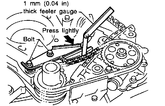 c. Insert 1 mm (0.04 inch) feeler gauge between guide and chain.