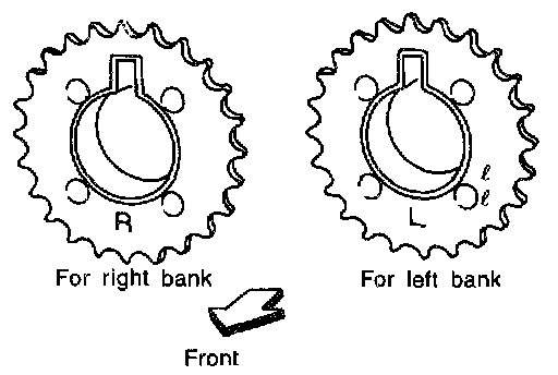 - The same type of cam sprockets are used for both left and right banks. Only the positioning direction changes. When installing, position camshaft sprockets on both right and left banks facing the side with "R" / "L" punchmarks toward front of engine, respectively.