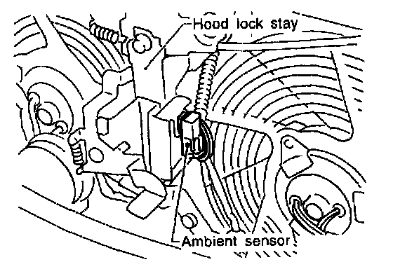 The ambient sensor is attached in front of the driver's side condenser. It detects ambient temperature and converts it into a resistance value which is then input to the auto amplifier.