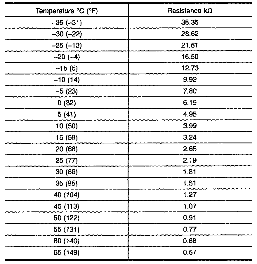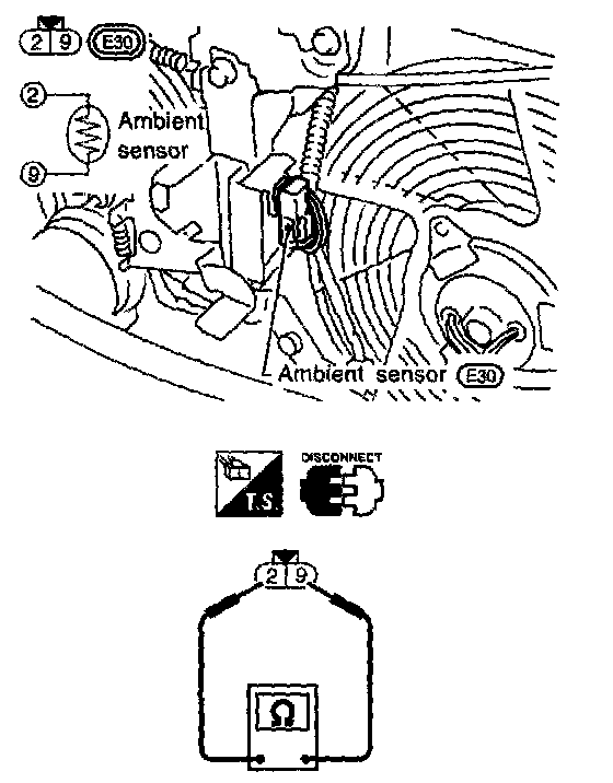 After disconnecting ambient sensor harness connector, measure resistance between terminals (9) and (2) at sensor harness side, using the table.