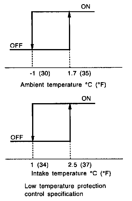 When ambient temperature is lower than 13°C (55°F) and the temperature detected by intake sensor is less than 7°C (45°F), the compressor turns OFF after receiving a signal from ECM.