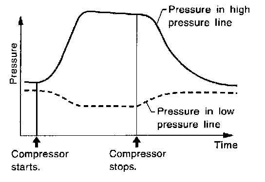 Refrigerant leaks should be checked immediately after stopping the engine. Begin with the leak detector at the compressor. The pressure on the high pressure side will gradually drop after refrigerant circulation stops and pressure on the low pressure side will gradually rise, as shown in the graph. Some leaks are more easily detected when pressure is high.