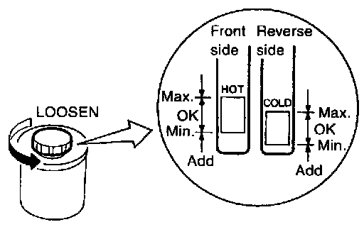 CHECKING FLUID LEVELCheck fluid level with dipstick on reservoir cap. Use "HOT" range at fluid temperatures from 50 to 80°C (122 to 176°F). Use "COLD" range at fluid temperatures from 0 to 30°C (32 to 86°F).