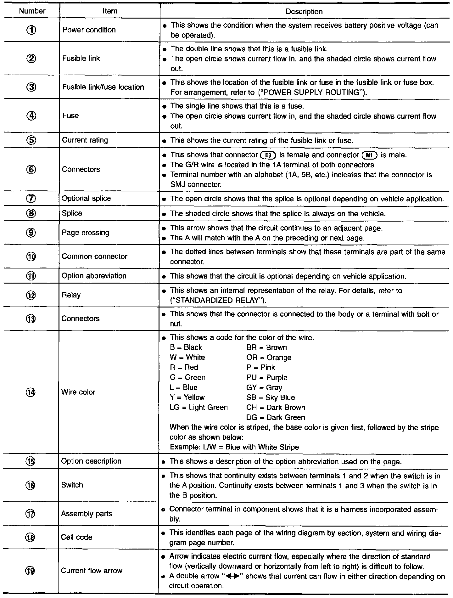 - Connector symbols shown from the terminal side are enclosed by a single line and followed by the direction mark.