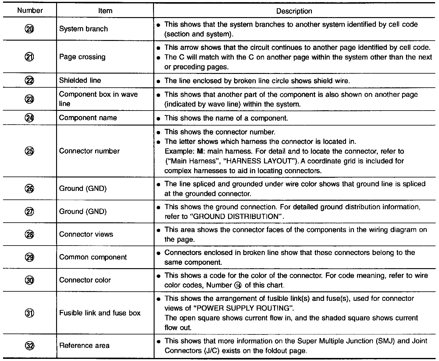- Connector symbols shown from the harness side are enclosed by a double line and followed by the direction mark.
