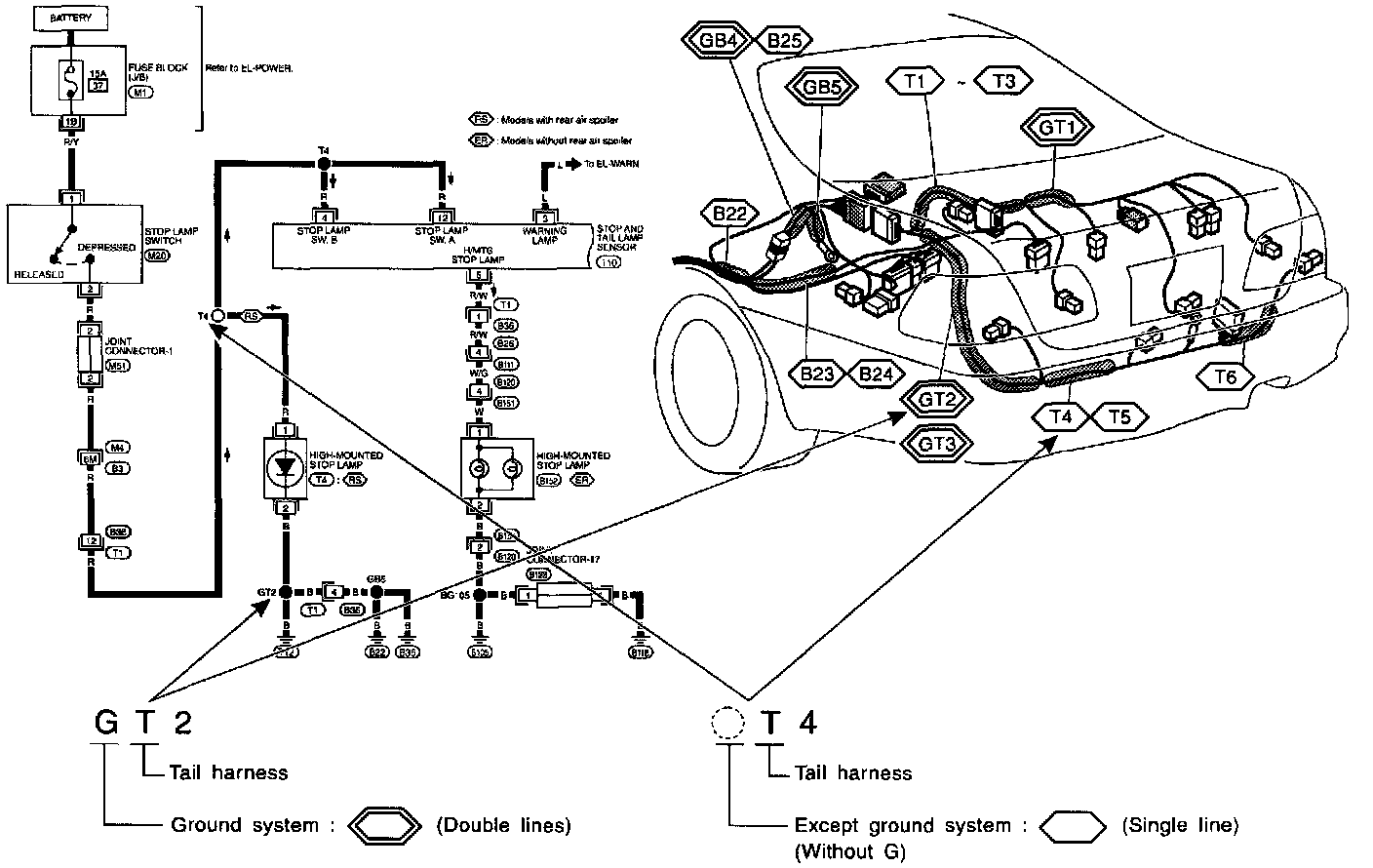 - "GT2", "T4" etc., which are shown in the wiring diagram, refer to the wiring harness splice points. These points are located in the shaded areas "GT2", "T4" , etc. in illustrations under the title "SPLICE LOCATIONS".