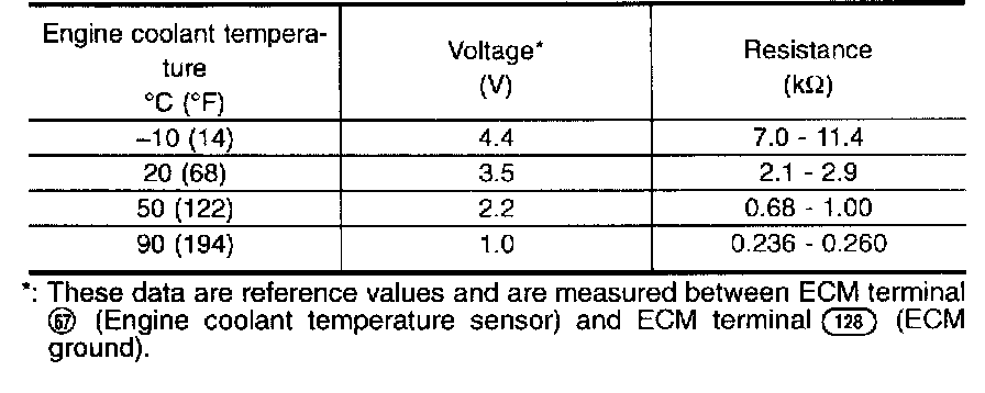 The engine coolant temperature sensor is located near the No.2 injector. The sensor is used to detect the engine coolant temperature. The sensor modifies a voltage signal from the ECM. The modified signal returns to the ECM as the engine coolant temperature input. The sensor uses a thermistor which is sensitive to the change in temperature. The electrical resistance of the thermistor decreases as temperature increases.