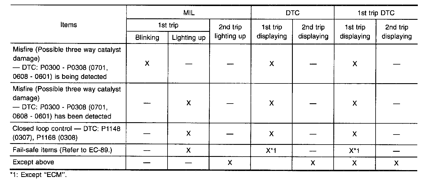 If the same malfunction is detected again during the next drive, the DTC and Freeze Frame data are stored in the ECM memory, and the MIL lights up. The MIL lights up at the same time when the DTC is stored. <2nd trip> The "trip" in the "Two Trip Detection Logic" means a driving mode in which self-diagnosis is performed during vehicle operation. Specific on board diagnostic items will cause the ECM to light up or blink the MIL and store DTC and Freeze Frame data, even in the 1st trip.